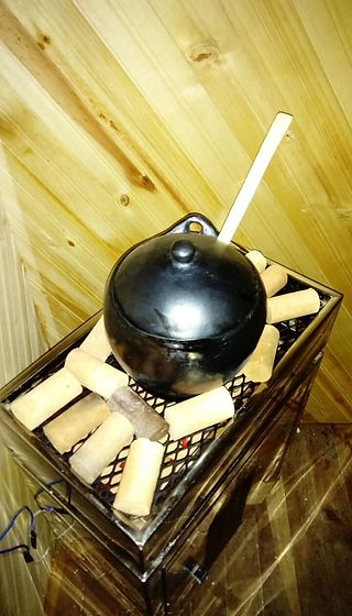 Mola, piedras, cuchara de madera.